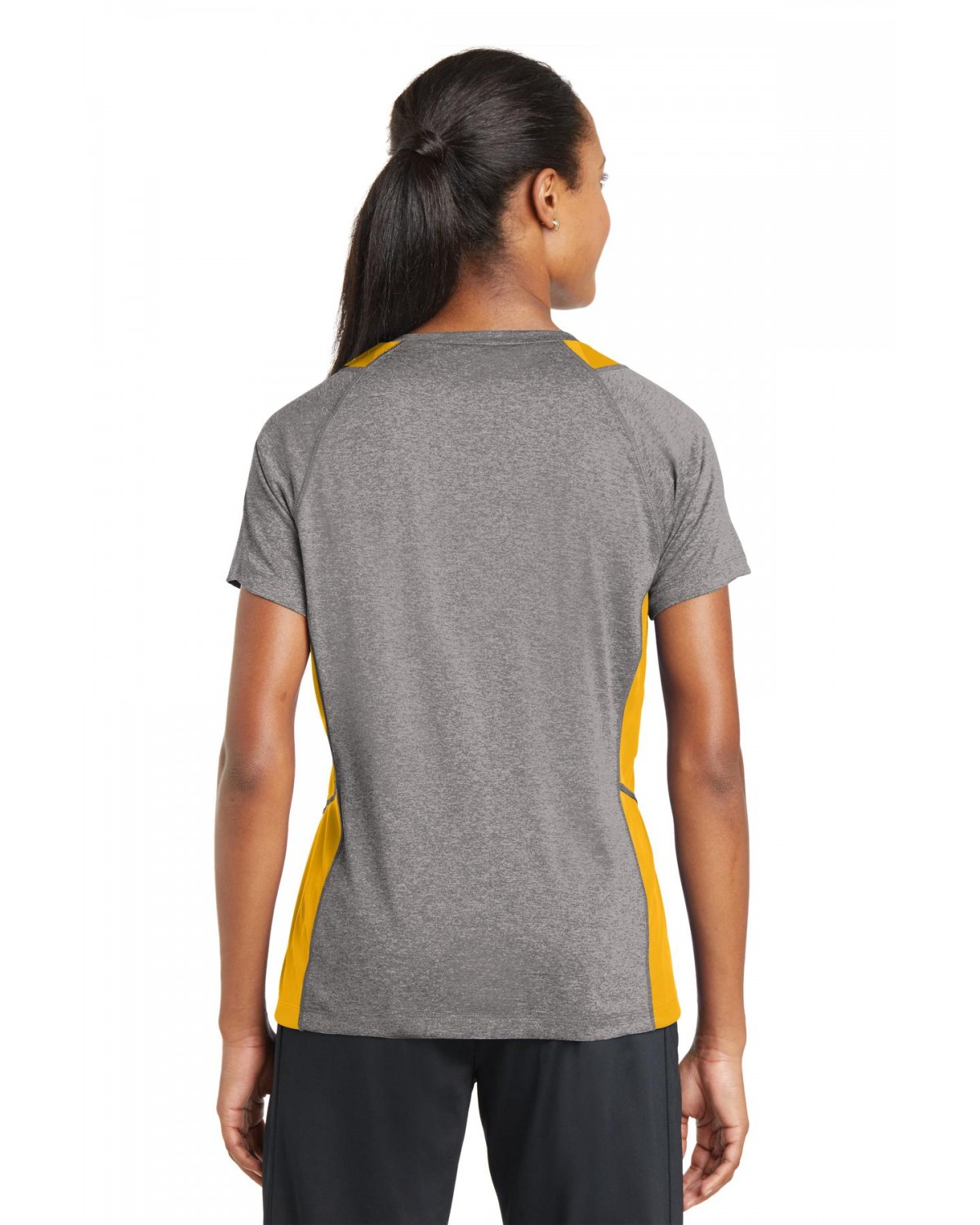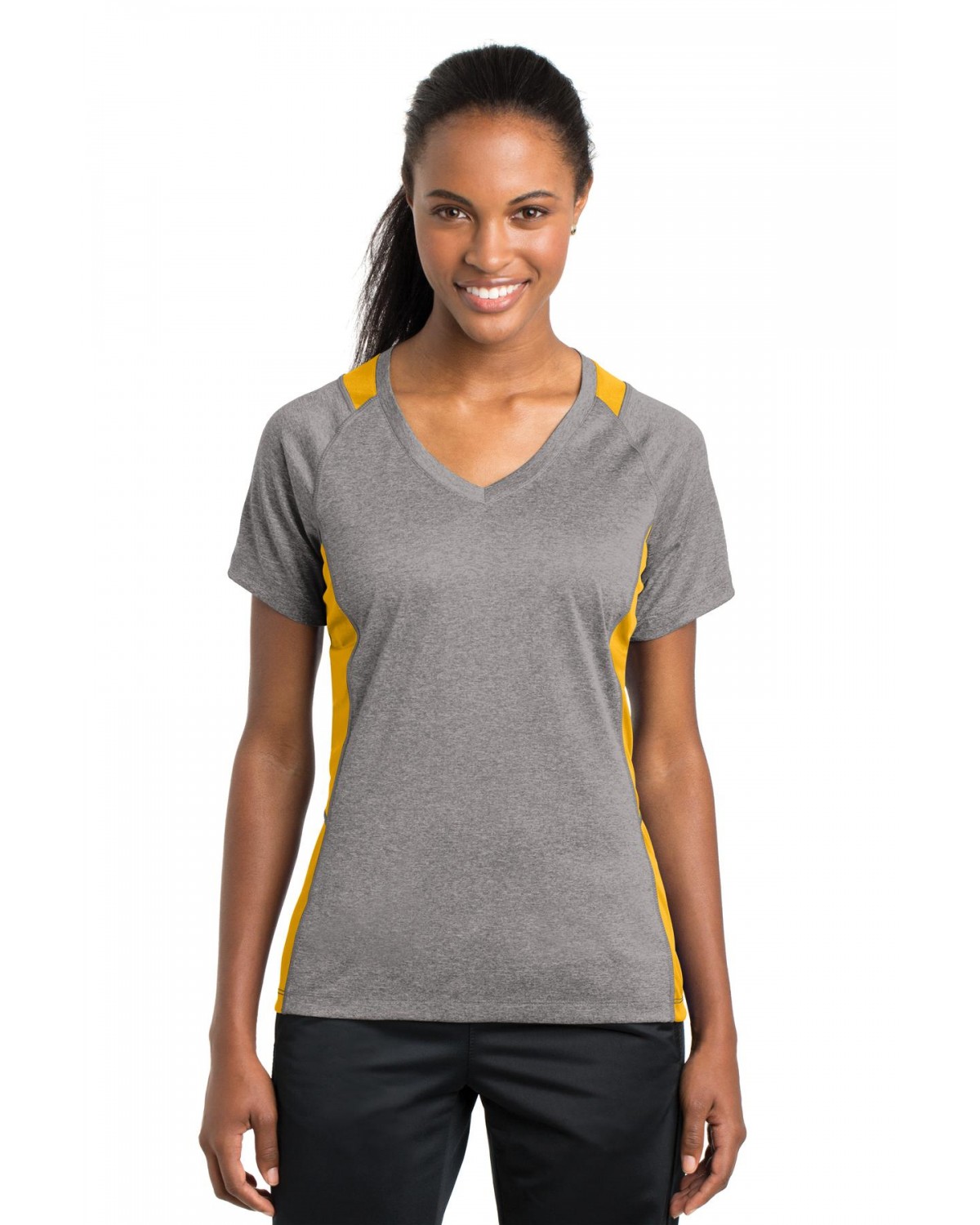 LST361 Sport-Tek LST361 Ladies Heather Colorblock Contender V-Neck Tee Vintage Heather/Gold View larger