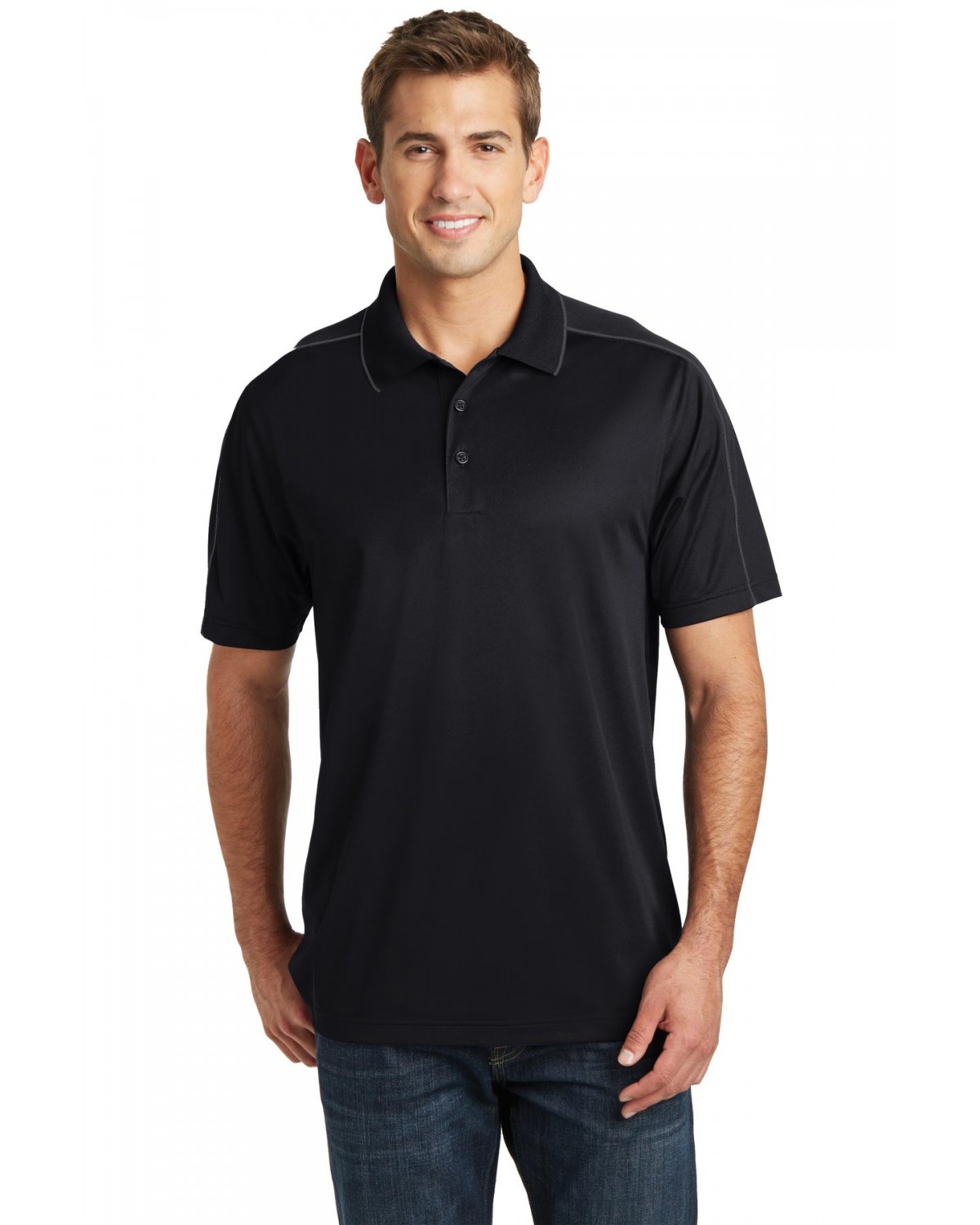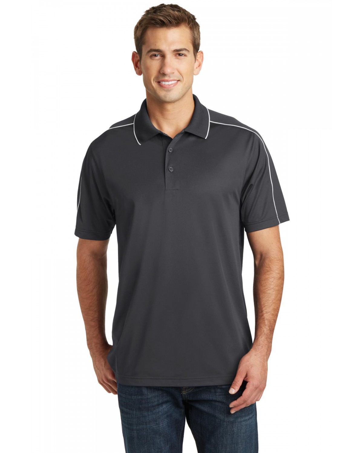 Piping on the shoulders and back give this moisture-wicking, snag-resistant polo sporty contrast.